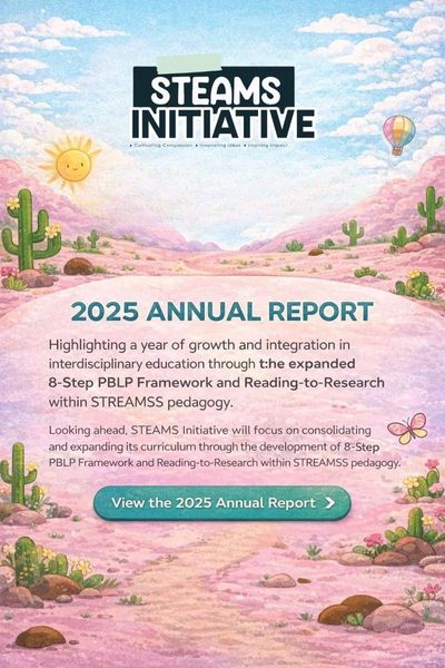 The STEAMS Initiative 2025 Annual Report highlights a year of growth, reflection, and intentional integration across interdisciplinary education. In 2025, the Initiative continued advancing project-based learning through the expanded 8-Step Project-Based Lesson Plan Framework, formally incorporating Reading-to-Research as part of the STREAMSS pedagogy cycle. The report outlines key curriculum developments, thematic focus areas, and the ways STEAMS Initiative resources support applied, community-connected learning across classrooms.